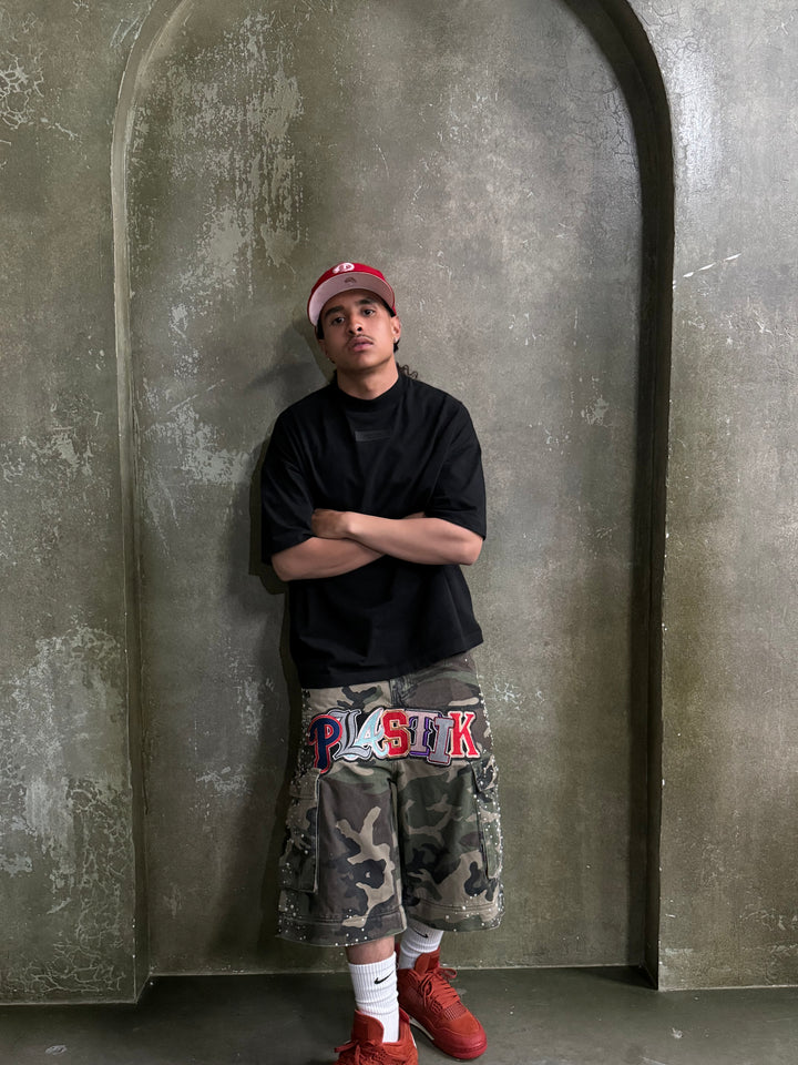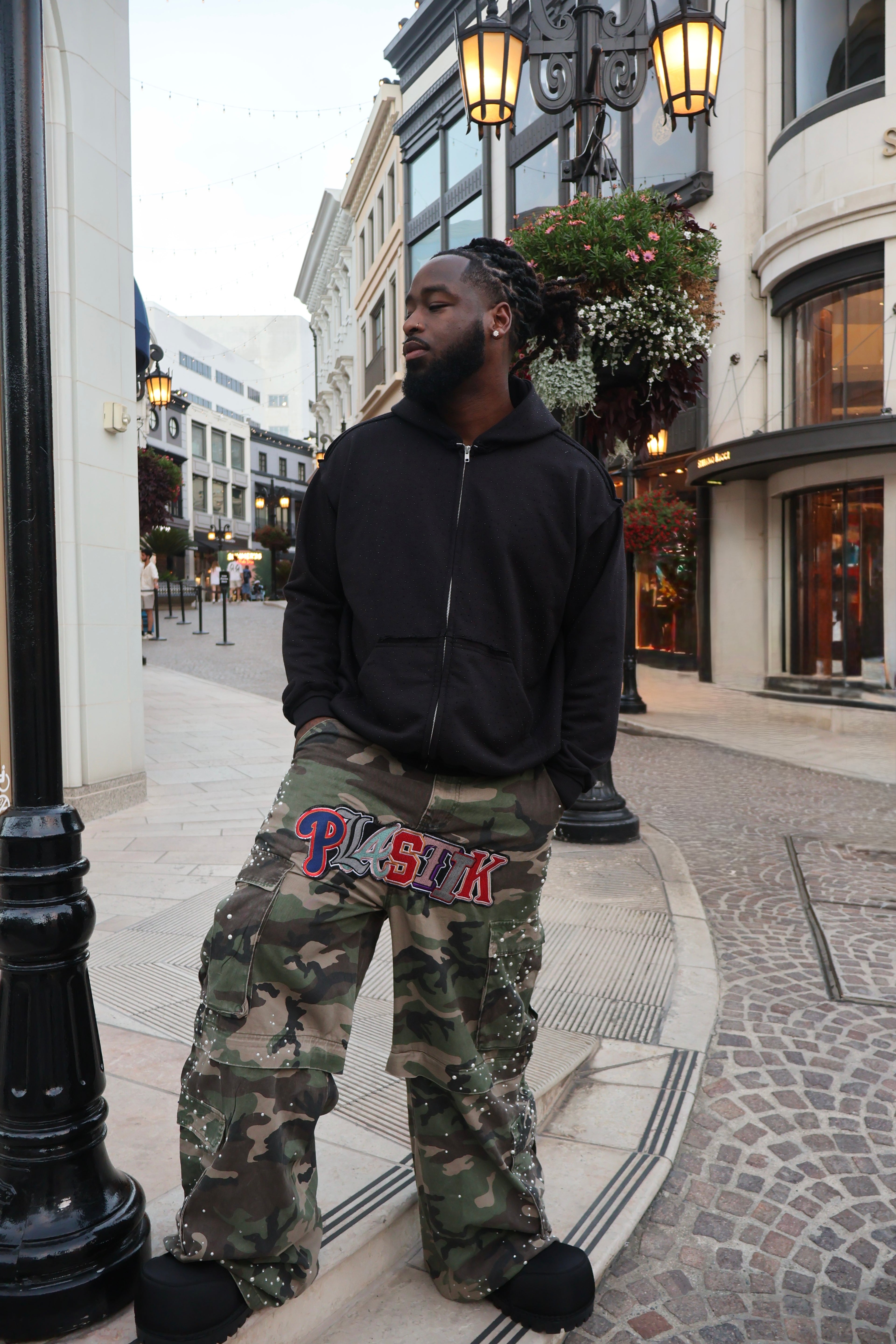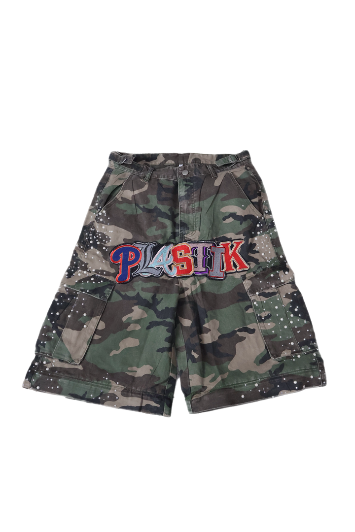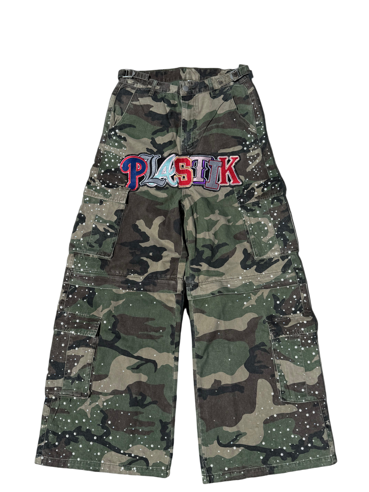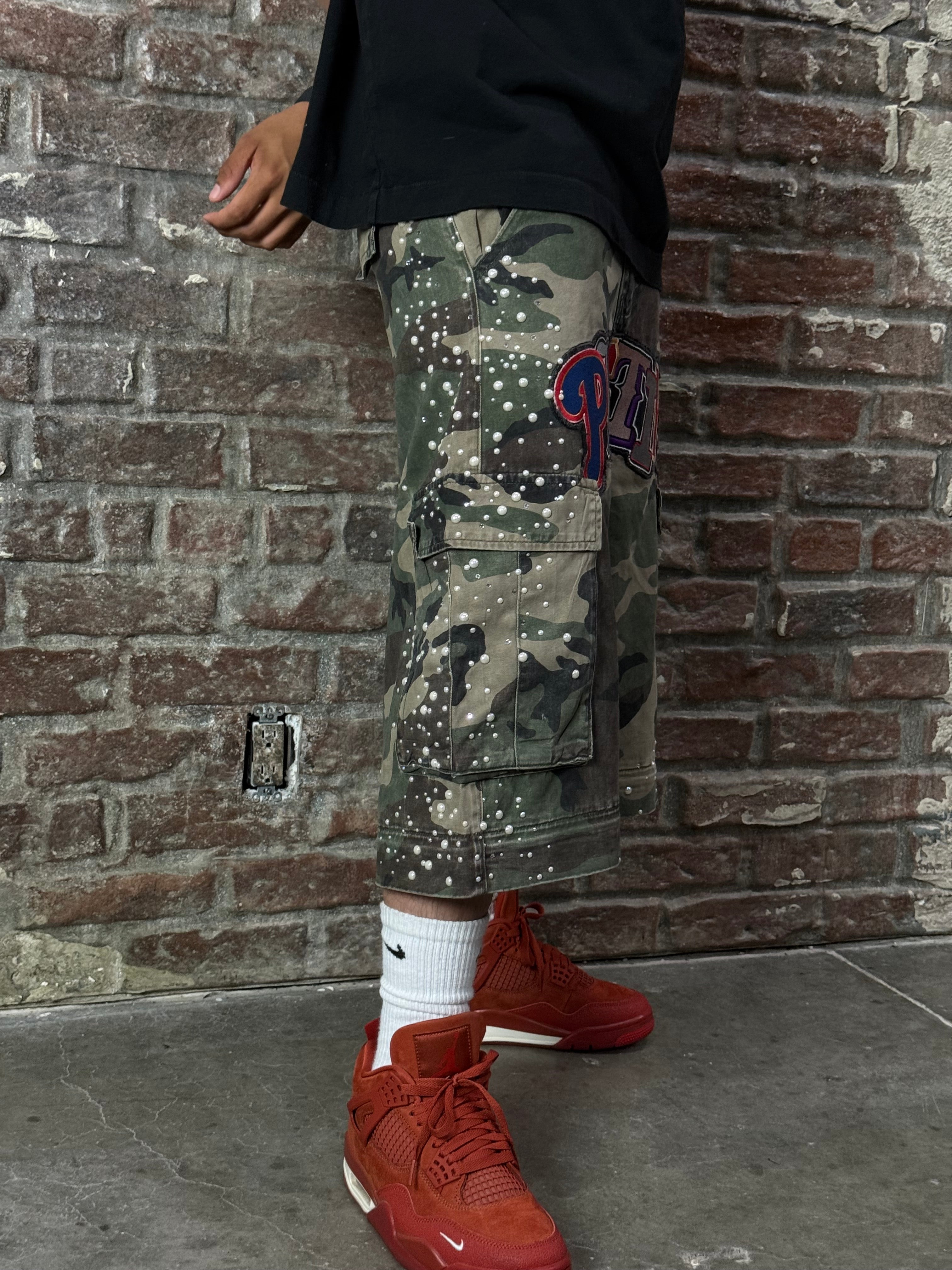Cargo pants with hand-applied pearls and rhinestones. Designed with multiple pockets and adjustable waist tabs. Convertible design allows wear as full-length pants or shorts. Each piece is unique.